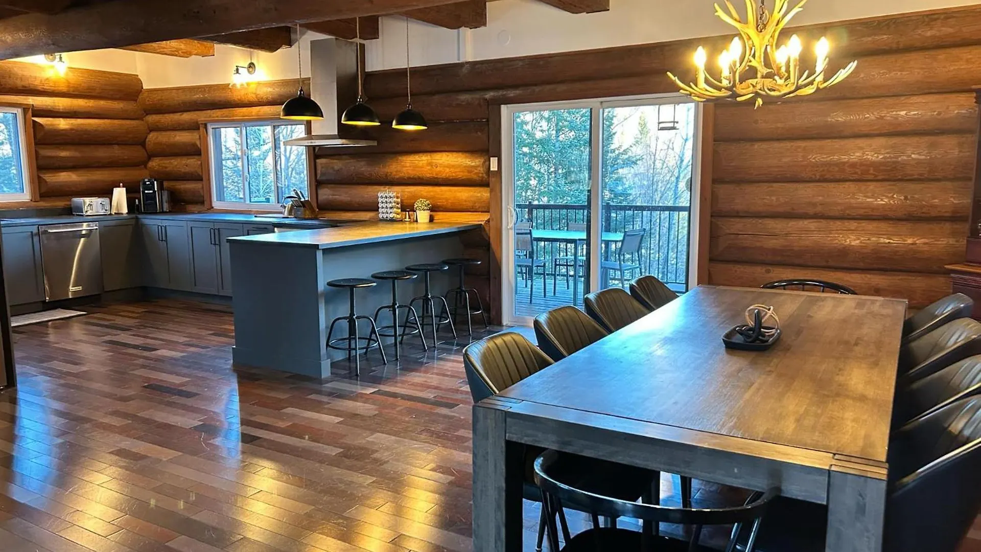 En séjournant à Villa L'Ensoleille à Lac-aux-Sables, les voyageurs peuvent se detendre sur une terrasse avec une table à manger.
