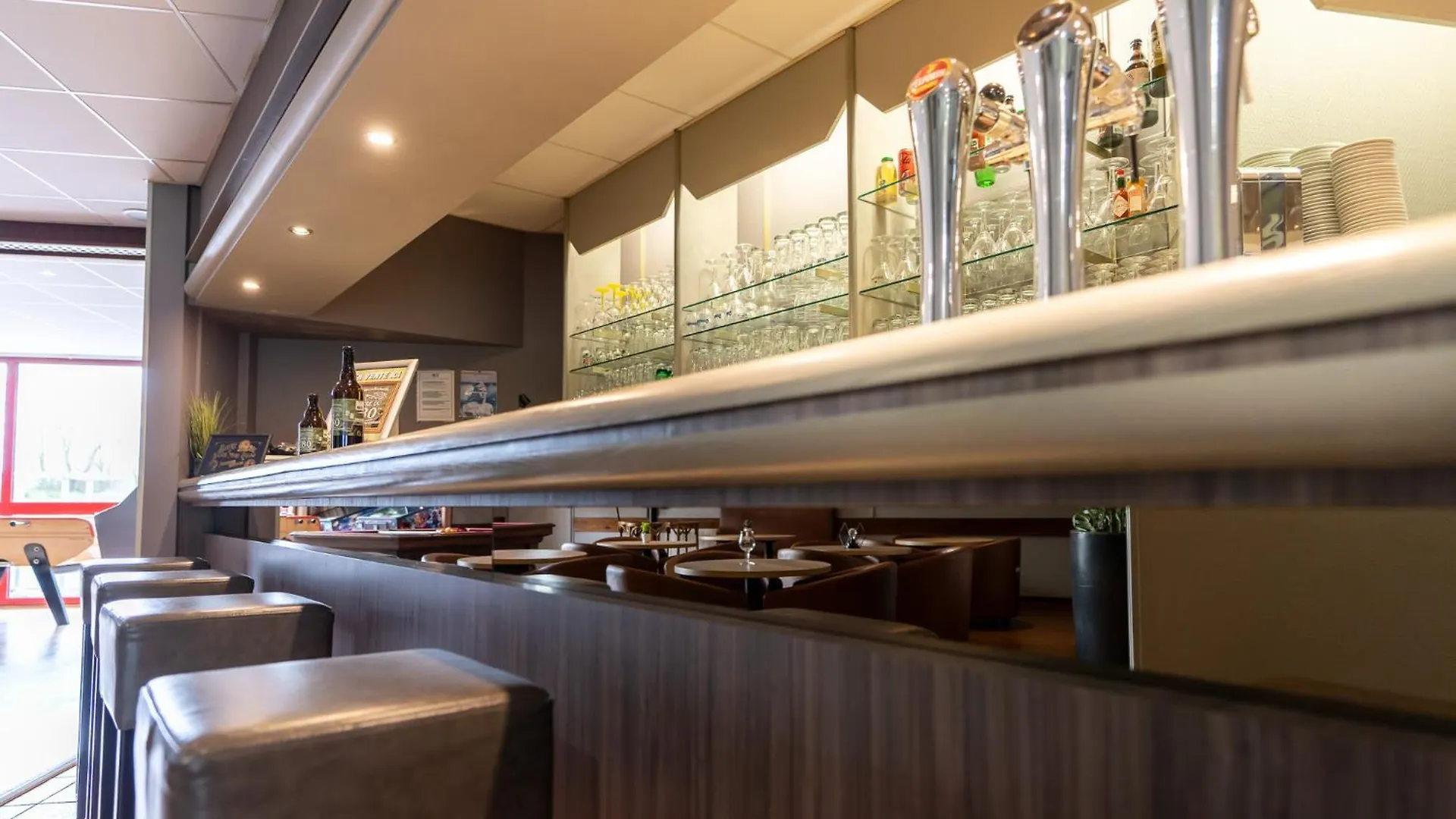 The Sainte-Mere-Eglise hotel invites guests to have a drink at a lounge bar.