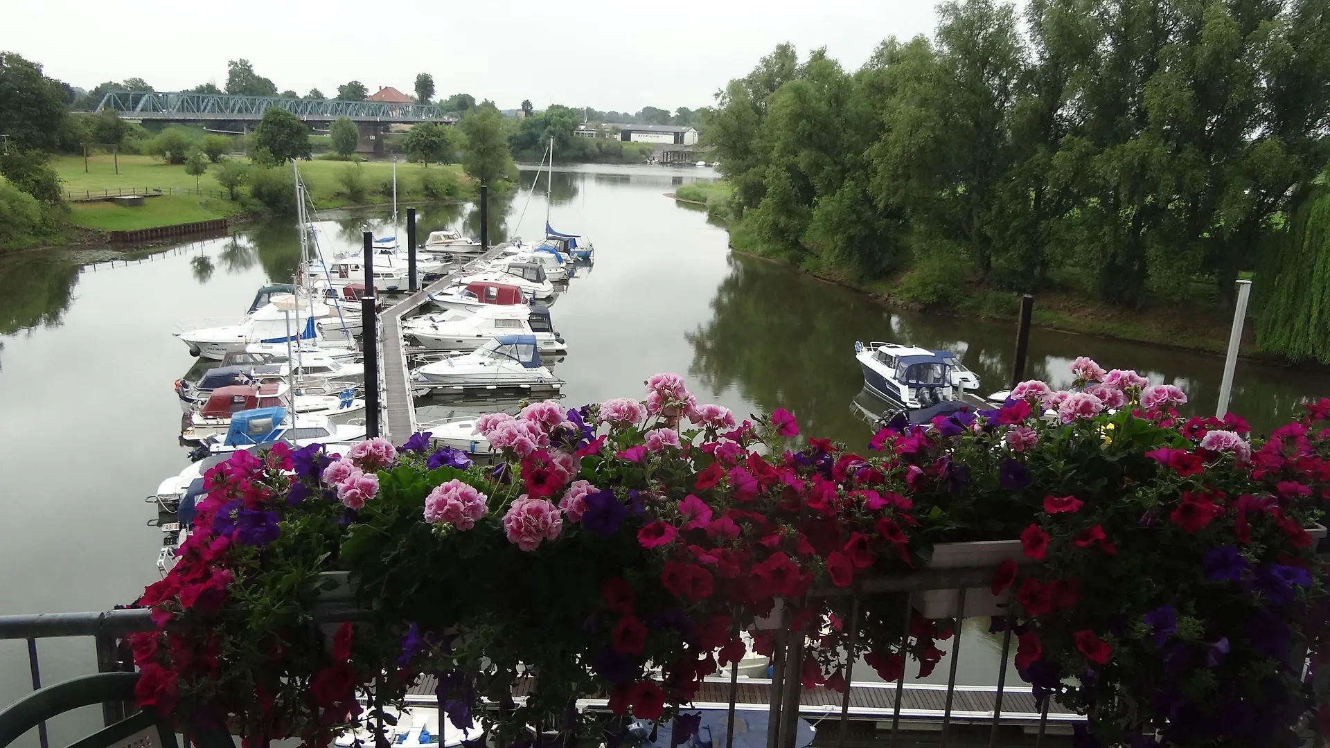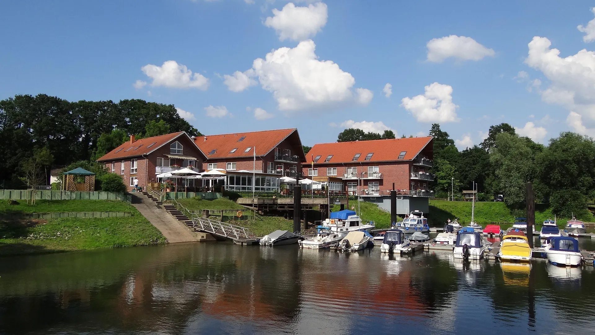 Walk along the Weser marina near Uesen, observing boats and the river landscape.