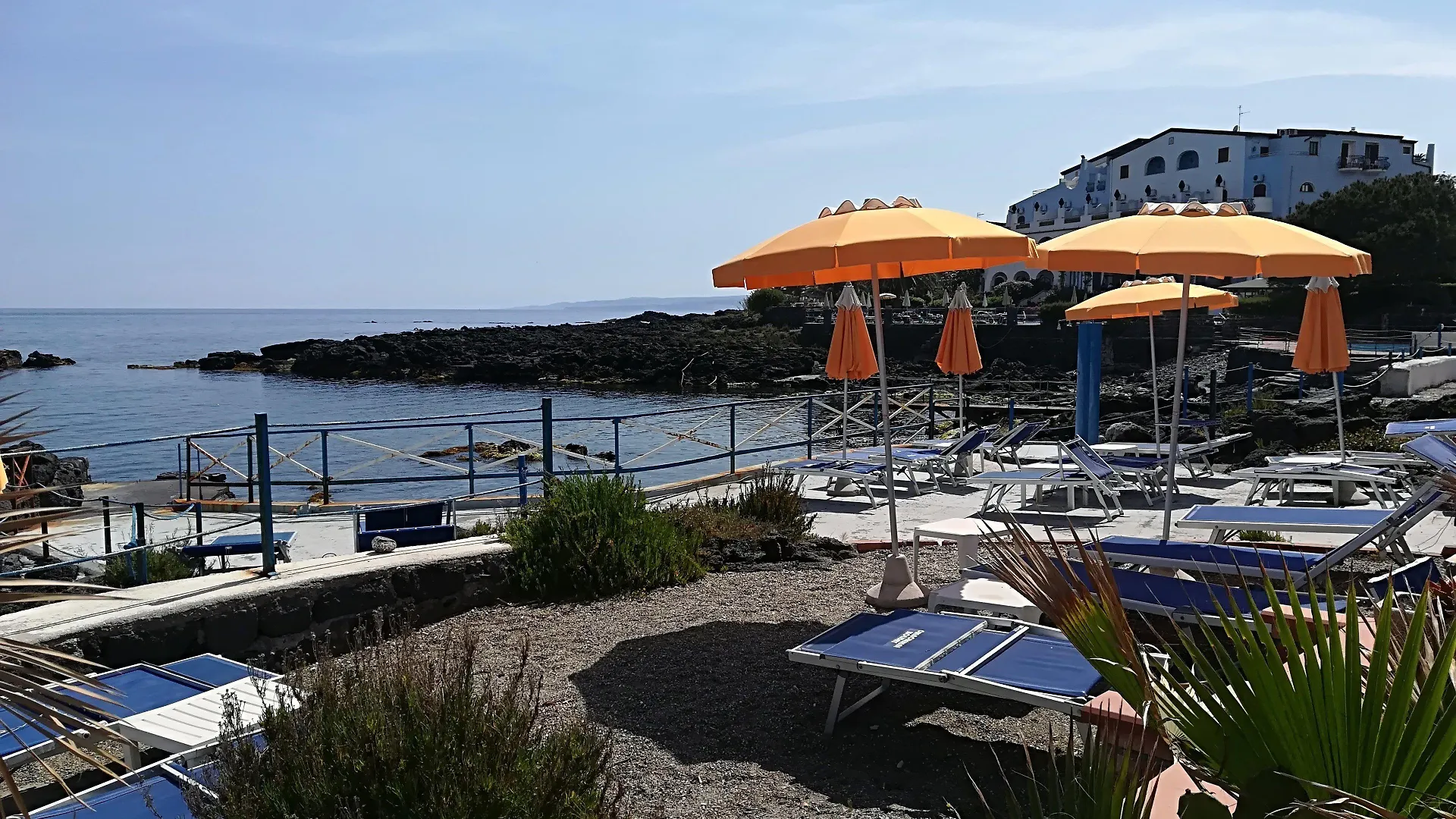 The Nike Giardini Naxos offers access to a charming beach with lounge chairs, beach chairs, and beach umbrellas.