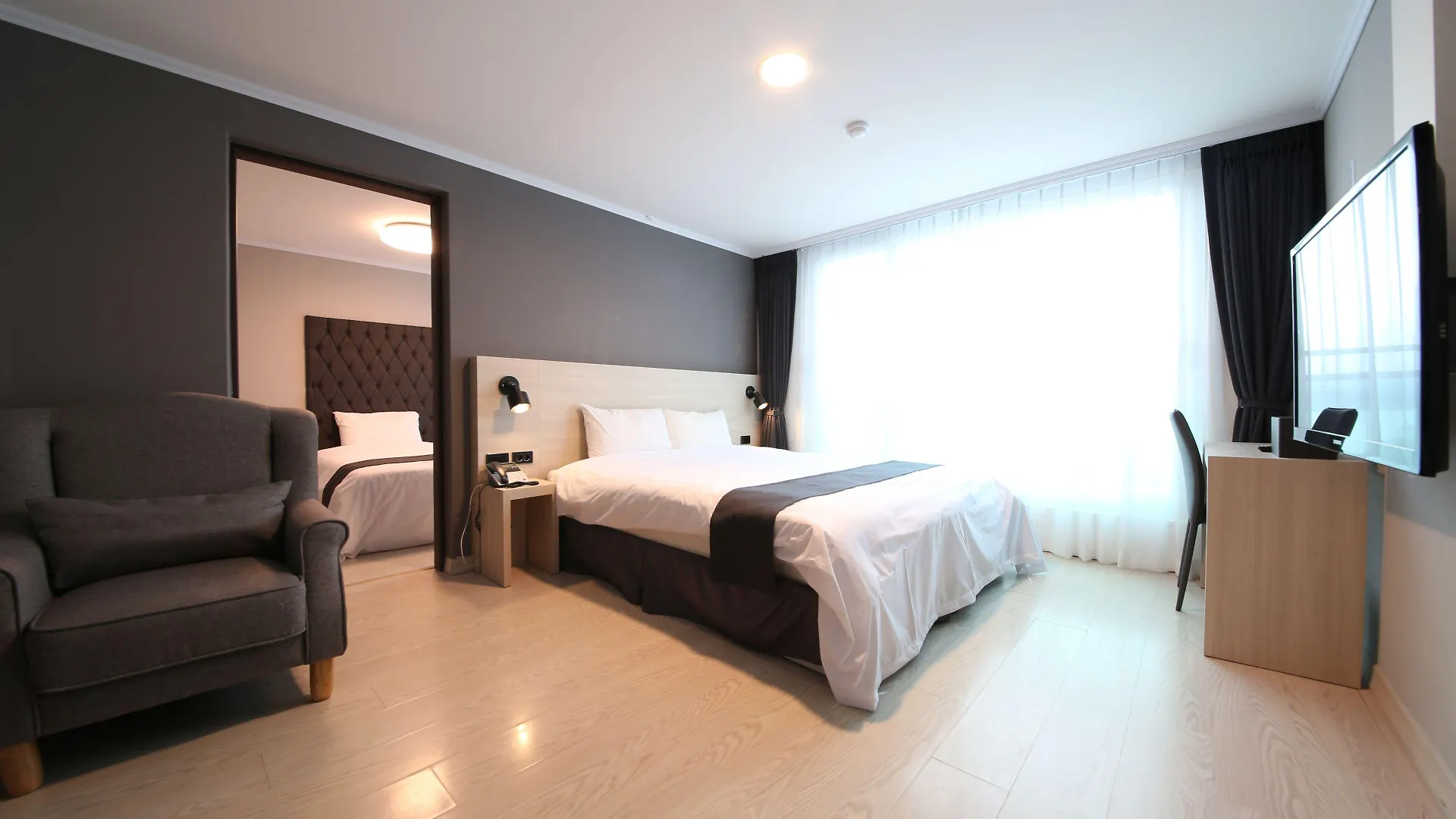 Gyeongpo Soo Hotel offers rooms with a sitting area featuring an air conditioner, along with WiFi and a flat-screen TV with satellite channels. A separate toilet and a shower, along with a hair dryer and bathrobes, are provided in the bathroom.