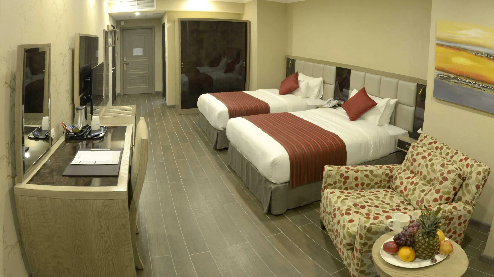 Ramada By Wyndham Bishkek Centre Hotel features 62 rooms with complimentary wireless internet and flat-screen television, as well as tea and coffee-making facilities. The rooms have elegant furniture featuring a writing desk.