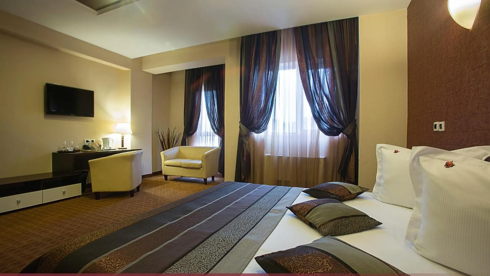 The hotel offers rooms with a dressing room and a sitting area featuring air conditioning, along with a flat-screen TV with satellite channels. Furnished with a writing table, they also have sound-proofed windows.