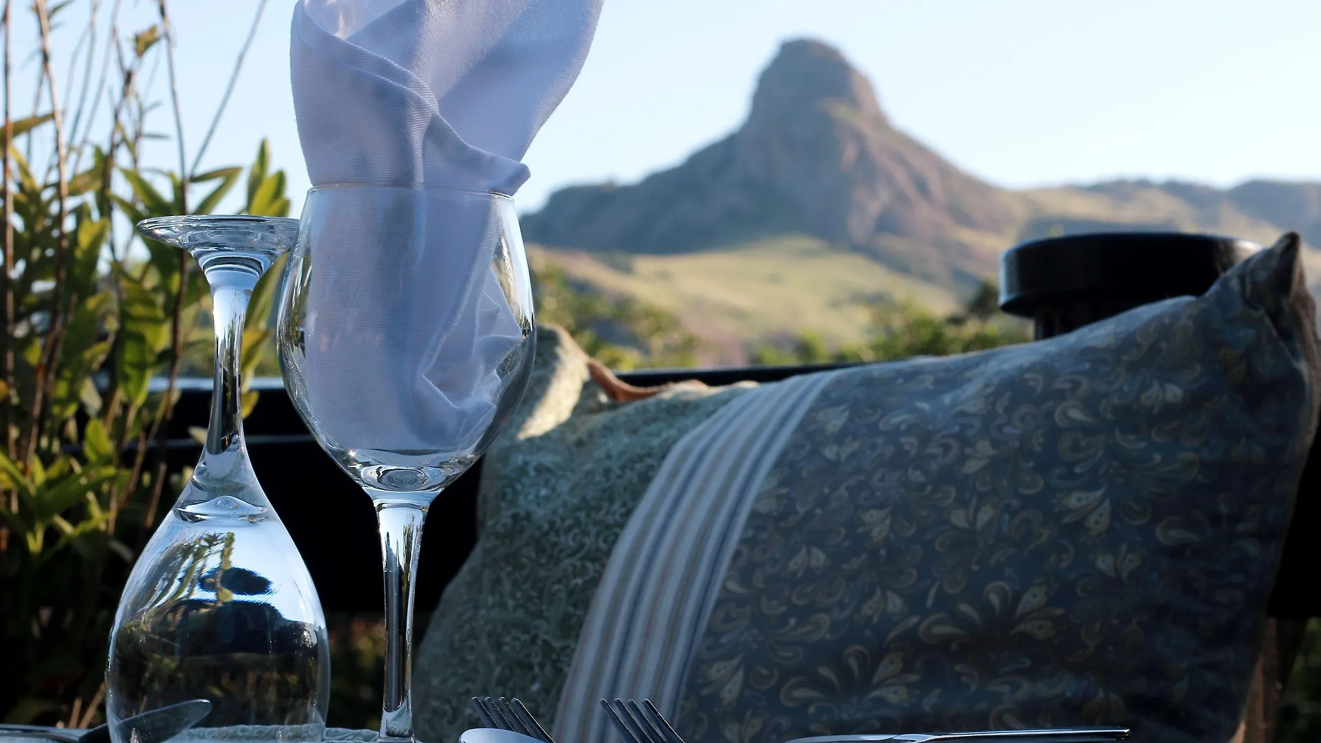 The Mantenga Lodge is situated among a valley and mountains.