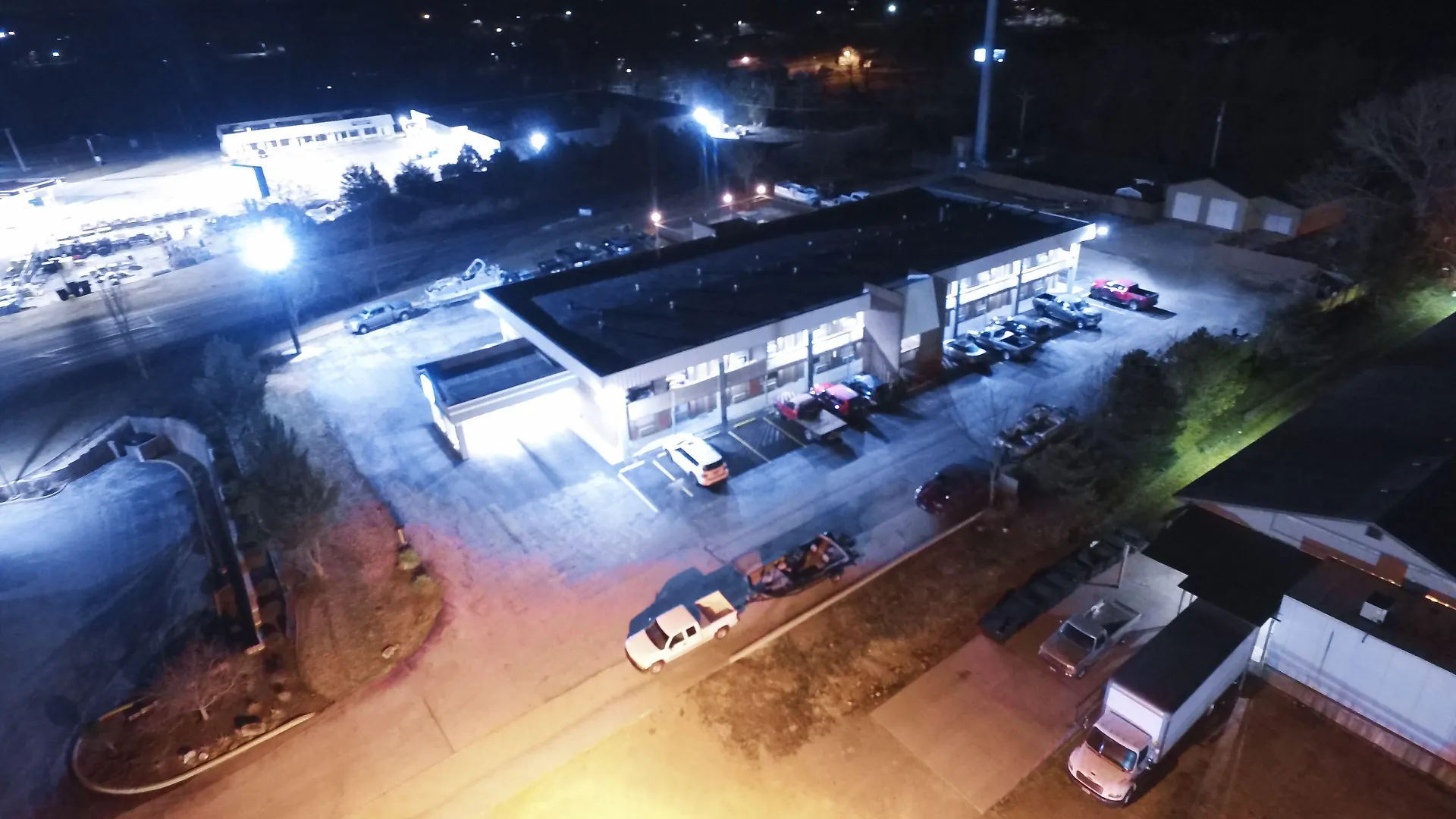 The downtown area features shops and restaurants, including the Warsaw Antique Mall, R-Bar & Grill, and Drake Harbor.