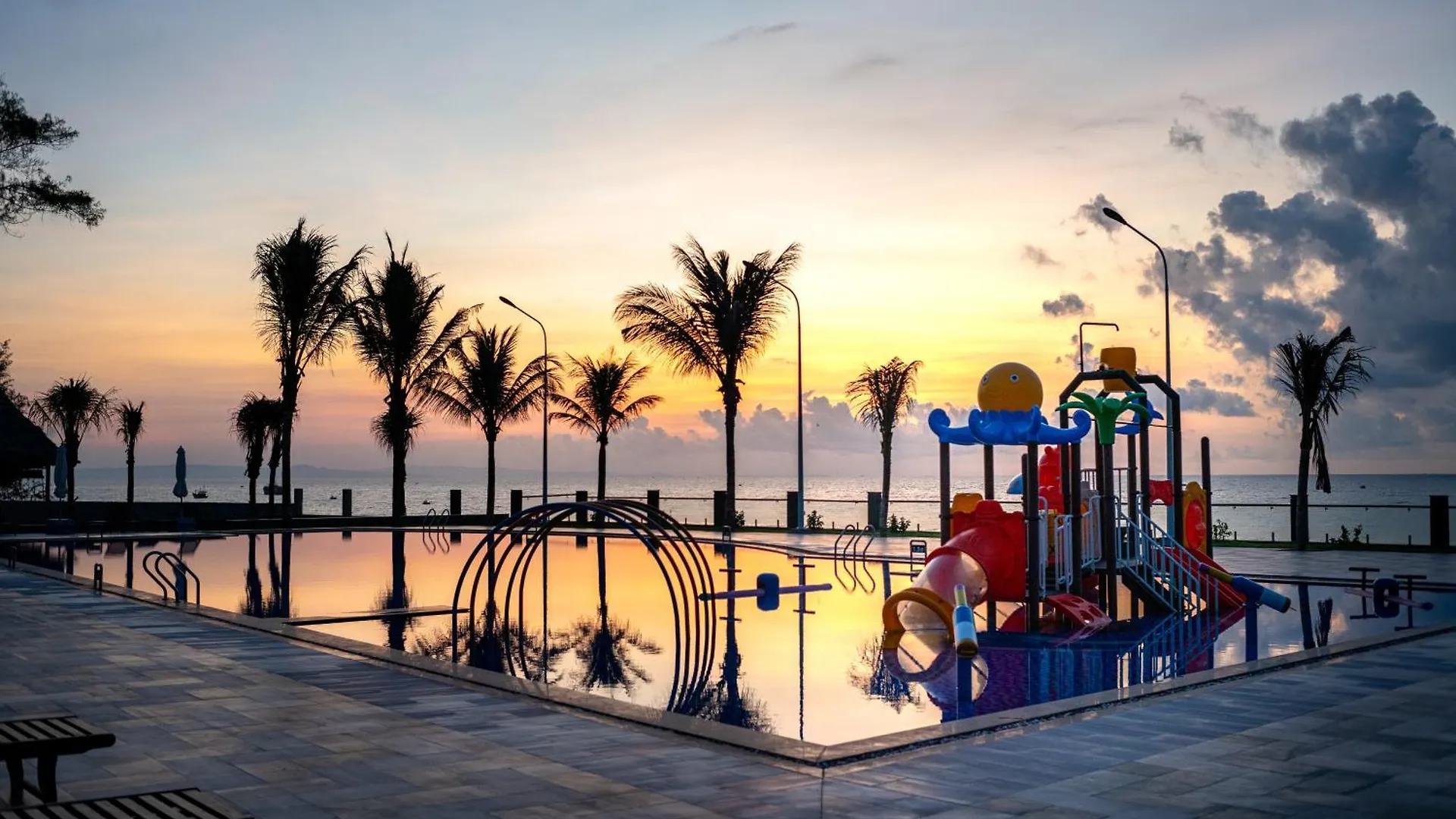 Swim in the infinity pool and slide on water slides.