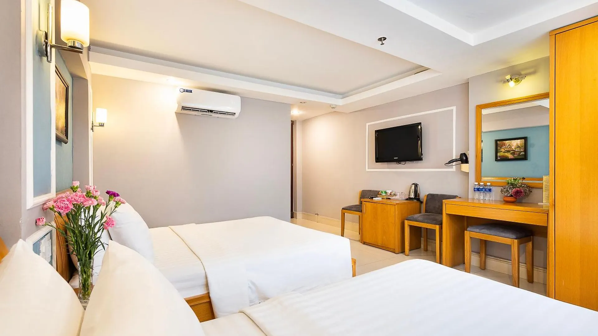 The Lucky Star Hotel 146 Nguyen Trai Ho Chi Minh City offers rooms with a seating area featuring an air conditioner, along with a flat-screen TV with satellite channels. Furnished with a writing desk, they also have a stone fireplace and sound-proofed windows. Offering towels and slippers, the bathrooms also feature a bidet, a separate toilet, and a shower.